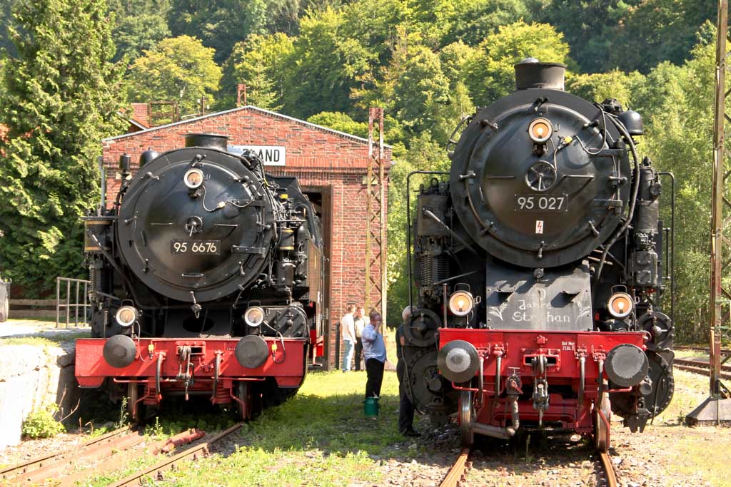 これらの機関車は、Preußenで開発された技術を用いつつも、デザインのいたるところに「来るべき制式機関車」の雰囲気をまとったものでした。写真左がその4両のうちの一つ、Mammut(マンモス)です。右はテストの結果を受けて開発・採用された Preußische T20 (のちに“Bergkönigin”(山の女王)と呼ばれたBR95)です。